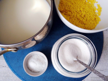 Как сварить молочную пшенную кашу? Подготовьте для этого все необходимое. Молоко я беру 2% жирности. Правильное пшено красивого желтого цвета с приятным ароматом.