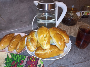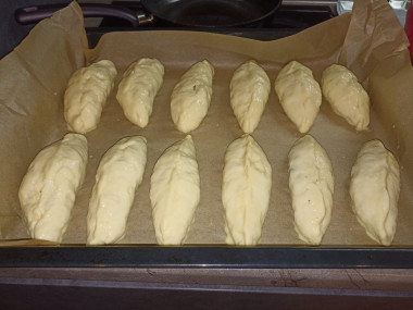 7) Пирожки укладываем на лист, смазанный маслом и даем им расстояться минут 15. На время расстойки пирожки лучше прикрыть легким полотенцем, чтобы не заветрили. Смазываем пирожки перед выпечкой взбитым яйцом и ставим в нагретую до 180 градусов духовку. Выпекаем пирожки до румяности. Готовые пирожки вынимаем, даем немного остыть и подаем.