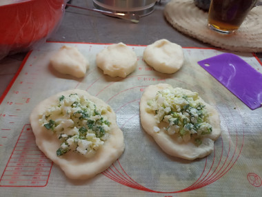 6) Когда тесто подошло (оно должно увеличиться в объеме в 2-2,5 раза), аккуратно его обминаем и выкладываем на стол, присыпанный мукой. Разделываем на кусочки нужной величины. Тесто очень нежное, податливое, даже не требует раскатки. Просто каждый кусочек теста приплющиваем и разминаем руками в лепешку. На середину лепешки выкладываем начинку. Тщательно защипываем края теста, формируя пирожок желаемой формы.