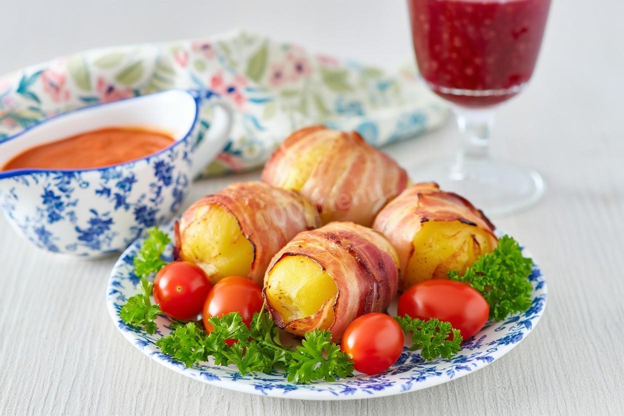 Картофель в беконе запеченный в духовке это супер! Продолжаю экспериментировать с беконом и на этот раз запекла в нем картошку по этому рецепту) Взяла четыре штучки на пробу. Сорт картошки не знаю, но она была с красной шкуркой. Бекон у меня копченый очень тонкой нарезки. Картошку предварительно посыпала солью со всех сторон, сдобрила паприкой и сушеной петрушкой. Тонкие пластинки бекона хорошо гнутся и без проблем обернули картофелины. Запекать решила в форме с крышкой, все таки картошка сырая, будет явно дольше готовиться, чем готовый бекон) Запекала тоже 40 минут. За это время картошка успела пропечься, стала мягкой, а бекон запекся до хрустящей корочки, но оставался слегка эластичным. На вкус мне очень понравилось! Картошка пропиталась жирком и специями и впитала вкусные ароматы. Внутри картошку немного досолила. Рецепт мне понравился, возьму на заметку)