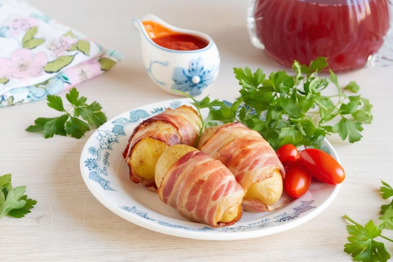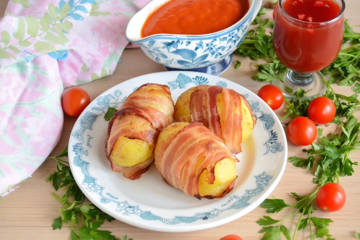 150гр бекона(8 тонких ломтиков) мне хватило на 4 картошки. Очищенные клубни покрывала беконом полностью. Картофель брала старый, молодой сейчас не найти. 20 минут без крышки в духовке, далее-под крышкой. И получилось просто великолепно. Без всяких соусов. Тает во рту. А аромат..