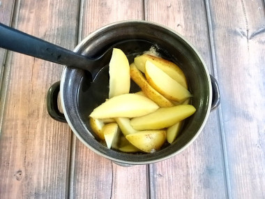 Налейте в кастрюлю воду, добавьте в нее немного соли, включите огонь. Когда вода закипит, выложите дольки картофеля в кастрюлю с водой и варите не более двух минут с момента закипания.