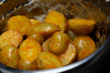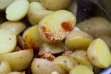 Оставьте картофель постоять в миске со специями около 10 минут, чтобы каждый ломтик хорошо пропитался специями и маслом.