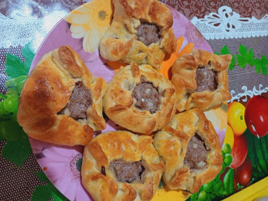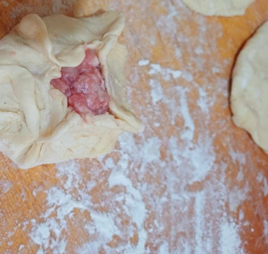 Возьмите один кусочек, разомните его руками в тонкую лепешку. По центру выложите фарш (около 1 ст. л.). Защипните края теста мешочком, оставляя серединку открытой. Так поступите и с остальными кусочками теста.