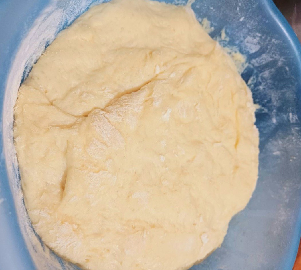 В миске смешайте муку, соль, сахар, быстродействующие дрожжи, яйцо. Влейте молоко с водой и начните ложкой замешивать тесто. Далее начните месить тесто руками. В конце замеса вмешайте мягкое сливочное масло. Тесто получается гладким, однородным, пластичным. Если тесто очень липкое, то добавьте ещё немного муки, если, наоборот, слишком крутое, что влейте немного теплого молока или воды. Сформируйте из теста шар, накройте пленкой и уберите в тепло на 1 час.