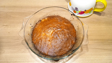 Выпекайте пирог примерно 30-40 минут. Ориентируйтесь на особенности своей духовки. Как проверить готовность выпечки? Когда верхний слой подрумянится, проткните изделие деревянной шпажкой в нескольких местах. Если она вышла сухой, значит пирог готов. Достаньте его из духовки, остудите, затем переложите из формы на тарелку. Сверху посыпьте через мелкое ситечко сахарной пудрой и подавайте к столу. Приятного аппетита!