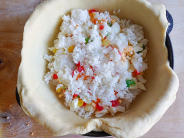 На тесто выложите часть риса, а сверху присыпьте частью изюма.