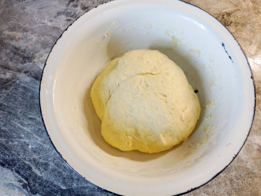 Всыпьте частями просеянную пшеничную муку, каждый раз вмешивая её в тесто сначала ложкой, а потом руками. Муки может понадобиться чуть больше или чуть меньше указанного количества. Ориентируйтесь на консистенцию теста: оно получается эластичным и гладким тесто и не должно оставаться на руках. Положите тесто в миску, накройте пищевой пленкой и оставьте его в теплом месте. Пока подходит тесто, займитесь приготовлением начинки.