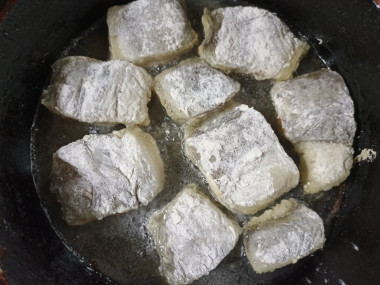 В сковороду налейте рафинированное растительное масло, хорошо разогрейте его. Проверить достаточно ли хорошо масло разогрелось, можно простым способом. Опустите в него деревянную лопатку, если вокруг нее собрались пузырьки, значит можно приступать к процессу жарки. Выложите кусочки рыбы и обжарьте их с двух сторон на среднем огне до золотистой корочки.