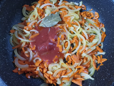 Томатную пасту смешайте в чашке с кипяченной водой и влейте в овощную зажарку. Всыпьте сахар (или сахарозаменитель, который не боится термической обработки), соль, перец горошком и лавровый лист. Томатную пасту можно заменить на помидоры в собственном соку, свежие помидоры или кетчуп. Если используете готовые специи для рыбы, обязательно прочитайте состав на упаковке. Если в смеси есть соль, учитывайте это, когда будете солить блюдо, чтобы не пересолить.