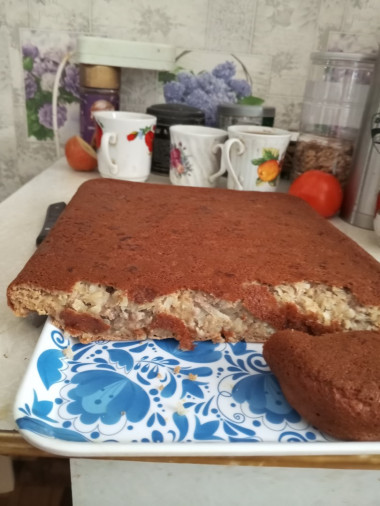 Смазать форму для выпечки маслом. Вылить в нее половину теста. Выложить начинку на расстоянии 1-1,5 см от края (бортиков) формы, чтобы тесто само образовало бортики пирога. Начинка тесто не продавит, дно пирога будет только из теста . Залить остатками теста.