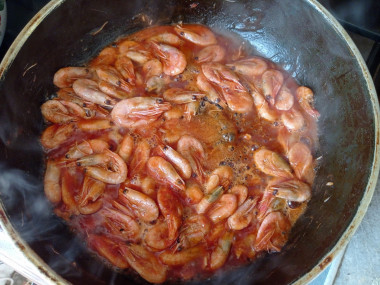 Я взяла 500 граммов мелких креветок. Обжаривала размороженные креветки около 2 минут. В кетчупе, соевом соусе и с чесноком они у меня обжаривались ещё минуты 3.