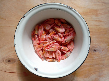 Разморозьте морепродукт, заранее переложив из морозилки на нижнюю полку холодильника. Откиньте размороженные креветки на дуршлаг, чтобы стекла лишняя жидкость.