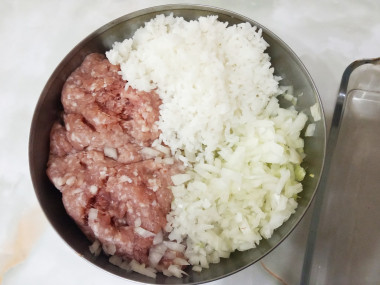 Очищенный репчатый лук измельчите в блендере или нашинкуйте мелко. Промойте рис в проточной воде, затем отварите его в подсоленной воде. Откиньте рис на сито. В миске соедините лук, рис, фарш, специи, соль по вкусу и все хорошо перемешайте.