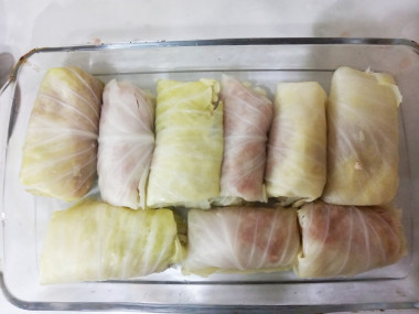Переложите свернутые голубцы в форму для запекания. Укладывайте их плотно друг к другу и швом вниз.