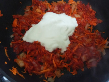 Обжарьте лук и морковь на сковороде с добавлением растительного масла до полуготовности. Помешивайте поджарку.