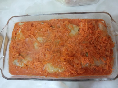 Залейте соусом голубцы в форме. Накройте форму фольгой и запекайте блюдо при 200 градусов около 40 минут. Учитывайте, что время приготовления зависит только от особенностей вашей духовки.
