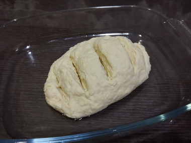 Тесто получилось мягкое и немного липкое, как описано в рецепте. Месила его, смазав руки растительным маслом. Сформировав круглую заготовку, поместила ее в форму. Сделала надрезы, чтобы хлеб лучше пропекся внутри. Надрезы получились неглубокие, так как нежное тесто расплывалось под ножом, не оставляя четкого следа.