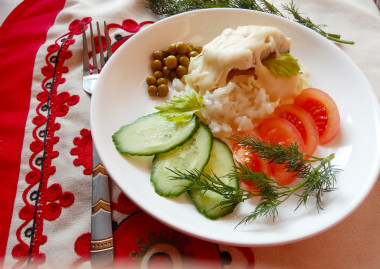Наше блюдо готово! Подавайте вкусный минтай с рисом на стол в горячем виде, при желании присыпьте мелконарезанным укропом.
