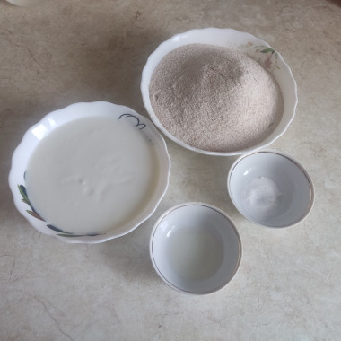 Как сделать лепешки без дрожжей? Подготовьте все продукты. У меня кефир 3,2% жирности. Имейте в виду, что от жирности кефира будет зависеть количество используемой муки: менее жирный кефир потребует чуть больше муки, чем указано. Кефир заранее достаньте из холодильника, чтобы он успел нагреться до комнатной температуры. Духовку разогрейте до 180 градусов.