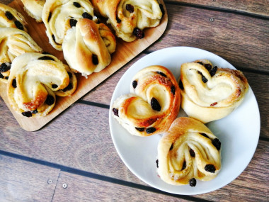 Тесто для булочек на молоке с дрожжами получилось замечательное! Мягкое, послушное, эластичное. Сделала из него небольшие плюшки с изюмом. Мякиш у плюшек - воздушный и нежный!