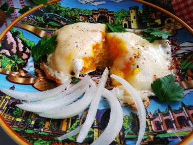 Подавайте готовую яичницу или на сковороде, или переложив на тарелку.