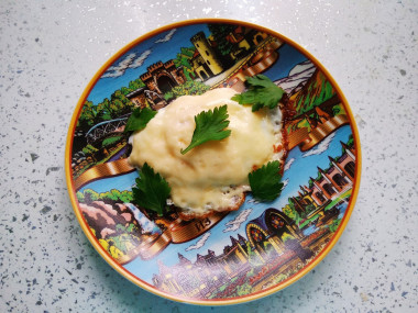 Каким будет желток в готовой яичнице, выбирать вам. Я люблю жидкий, но можно прожарить его сильнее, регулируйте это по своему вкусу. Когда желтки будут почти готовы, посыпьте яичницу сыром. Жарьте яичницу еще 2-3 минуты, до расплавления сыра. Можете накрыть сковороду крышкой, тогда сыр расплавится быстрее, но желток при этом может побелеть. Я так не делаю, жарю всегда без крышки. Готовую яичницу посыпьте зеленью.