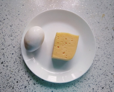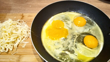 Как сделать яичницу с сыром на сковороде? Подготовьте продукты. На одну порцию достаточно двух яиц, но у меня были только мелкие яйца, я взяла три. Сыр для рецепта подойдет лучше тот, который хорошо плавится. Выбирайте сыр хорошего качества, без заменителей молочных жиров.