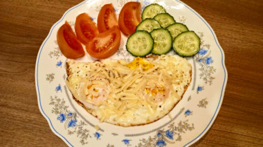 Яичница с сыром на сковороде - любимый и простой завтрак. Пока жарились яйца, натерла сыр, порезала овощи. Свежие помидоры с огурцами как нельзя кстати подходят к этому блюду, освежают и дополняют его. Такой завтрак всегда сытный и желанный у нас. На сливочном масле яичница особенно вкусна и ароматна. Готовьте с удовольствием!
