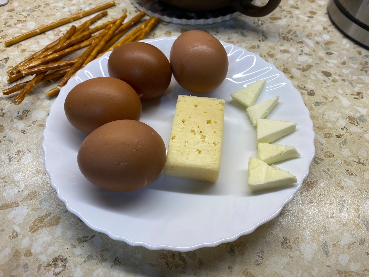 Как сделать яичницу с сыром на сковороде? Подготовьте продукты. На одну порцию достаточно двух яиц, но у меня были только мелкие яйца, я взяла три. Сыр для рецепта подойдет лучше тот, который хорошо плавится. Выбирайте сыр хорошего качества, без заменителей молочных жиров.Шаг 2: