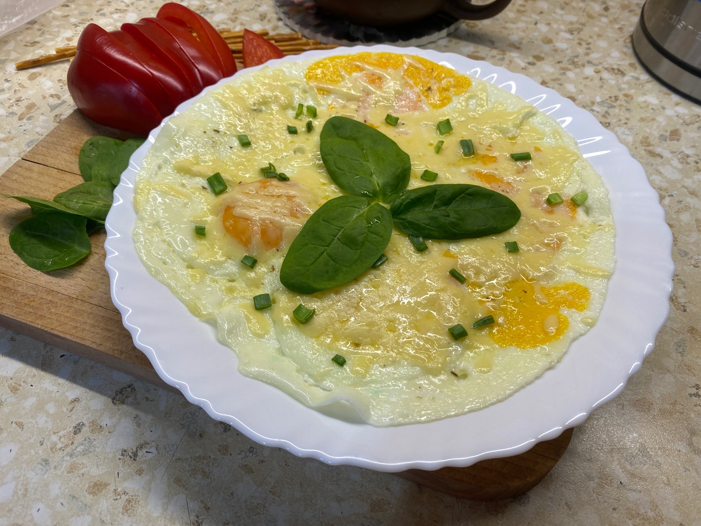 Мое самое любимое блюдо на завтрак-это яичница с сыром. На разогретую сковороду с ароматным сливочным маслом я разбиваю свежие яйца. Добавляю щепотку соли и свежемолотого перца.Сверху щедро посыпаю тёртым сыром, который сразу начинает таять, и добавляю свежую зелень- блюдо сразу наполняется яркими красками и ароматами. Накрываю крышкой и даю всему этому волшебству медленно схватиться 4–5 минут, пока сыр расплавится, а яйца останутся нежными. Подаю прямо со сковороды — горячую, ароматную, такую простую и вместе с тем невероятно вкусную яичницу.