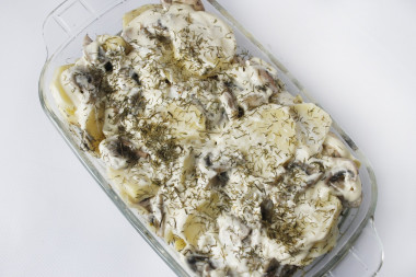 Для запекания подойдет любая жаропрочная форма. Я буду готовить в керамической. Дно и бока формы смажьте растительным маслом. Картофель с грибами переложите в подготовленную форму и равномерно распределите. Поставьте форму в духовку, предварительно разогретую до 180 градусов, примерно на 40 минут. Время указано приблизительно, ориентируйтесь по своей духовке. Подробнее об этом читайте в конце рецепта. Чтобы верх не подсыхал, можно немного прикрыть фольгой.