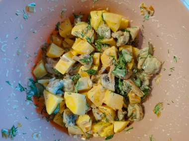 Добавьте к картофелю сметану, измельченную зелень, соль и специи. Перемешайте.