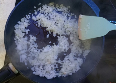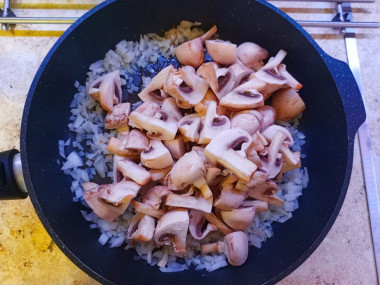 Лук очистите, ополосните и измельчите. На сковороду налейте немного растительного масла. Обжарьте в течение минуты мелко нарезанный лук, затем добавьте к нему шампиньоны. Обжаривайте все вместе 3-5 минут. До полной готовности жарить не надо - грибы допекутся в духовке. Дождитесь, чтобы грибы стали уменьшатся в размере.