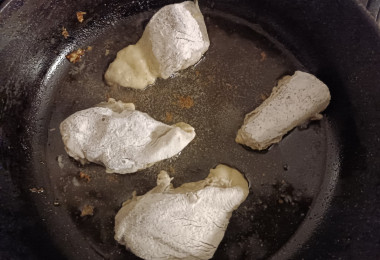 Муку использовала цельнозерновую. Добавила в нее паприку, куркуму, сушеный укроп, черный перец и ещё немного соли. Рыбу обваляла в этой ароматной смеси и жарила в разогретом масле до образования золотистой корочки.