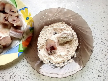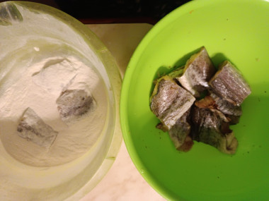 В муке удобно панировать таким образом: насыпать в чашку среднего размера просеянную муку и положить сверху кусочки рыбы сверху и круговыми движениями слегка потрясти, тогда рыба равномерно покроется мукой, а руки останутся чистыми.