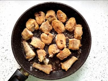 Жарила в небольшом количестве масла. Может быть из-за того, что рыба влажная (все-таки размороженная рыба очень отличается от свежей), на некоторых кусочках панировка слезла... Думаю, это из-за того, что нарезала кусочки по-другому, ни как автор...