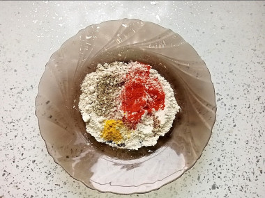 В отдельной чаше смешайте муку с солью и специями. В качестве специи можно использовать прованские травы, готовый набор специй для рыбы или ограничиться, всего лишь, молотым перцем.