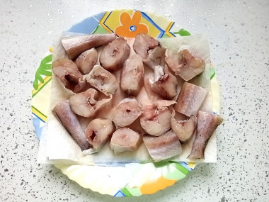 У рыб отрежьте хвост и плавники. Удалите внутренности. Рыбу хорошо промойте в проточной воде и обсушите бумажными полотенцами, чтобы удалить с неё лишнюю влагу. Нарежьте минтай на кусочки, толщиной 4-5 см.
