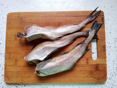 Минтай удобнее разделывать, когда он чуть подтаял, но остался ещё слегка подморожен, т.к. легче вырезать плавники (всегда вырезаю слегка под углом вглубь, чтобы не оставались мелкие кости под плавниками) и резать на порционные кусочки.