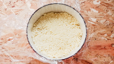 Чем дольше будете варить массу, тем тверже получится сыр. Когда масса загустеет и немного остынет, возьмите формочку, подходящую по размеру под объем получившейся сырной массы. Затяните форму пищевой пленкой, выложите в нее заготовку сыра и уберите в холодильник на 2-3 часа.