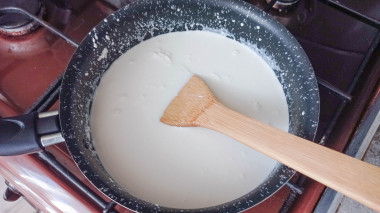 В кастрюльку выложите творог и залейте его молоком. С выбором идеальной кастрюли поможет статья о кастрюлях, ссылка в конце рецепта. Поставьте кастрюлю на медленный огонь и начните варить, постоянно мешая ложкой или деревянной лопаткой. Творог начнет плавиться. Сначала смесь станет жидкой, а потом начнет густеть. Не прекращайте перемешивать массу. Варите творог с молоком около 30 минут.