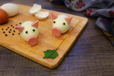 8. В яйца воткнуть "пятачок", "ушки" и "хвостик", вырезанные из колбасы, а "глазки" из перца;