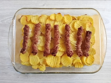 Картошку нарезала фигурным ножом и промыла от крахмала. Затем посолила, перемешала и выложила в форму. Сверху выдавила колбаски. Запекала блюдо 1 час при 180°С.