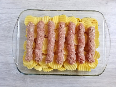 Фарш переложите в кулинарный мешок. Если мешка нет, то в плотный полиэтиленовый пакет. Кончик отрежьте так, чтобы ширина отверстия стала около 2,5 см. Отсадите фарш в виде колбасок на картошку. Если не хочется возиться с пакетами, то просто сформируйте колбаски руками. Влейте в форму немного воды, примерно пару сантиметров от дна.