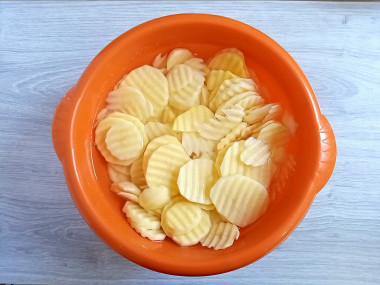 Перед началом запекания включите духовку разогреваться на 180°С. Очищенный картофель нарежьте тонкими пластинками.