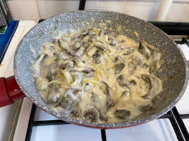 Добавьте подготовленный сметанный соус к печени, перемешайте, добавьте соль, чёрный молотый перец и другие специи по вкусу, накройте крышкой и тушите около 15 минут.