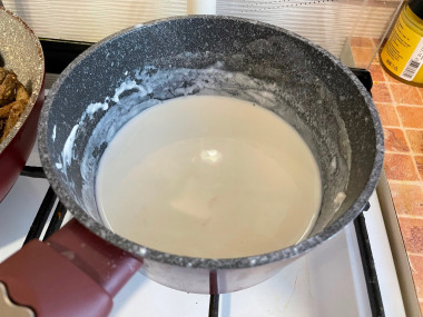 В сотейник влейте воду и разведите муку, постоянно помешивая, чтобы не было комочков. Подготовленную смесь поставьте на медленный огонь, и нагрейте, постоянно помешивая, до закипания. Добавьте сметану, все хорошенько перемешайте и доведите до кипения, не забывая постоянно помешивать, чтоб ничего не пригорело.