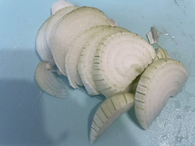 Репчатый лук очистите и нарежьте полукольцами. Добавьте нарезанный лук к печени и на небольшом огне обжарьте всё вместе в течение 5 - 10 минут. Можно накрыть сковороду крышкой.