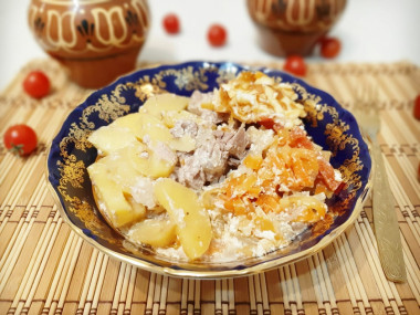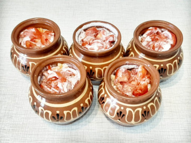 По рецепту индейка в горшочках с картошкой, приготовила говядину, предварительно отбив мясо, чтобы после приготовления оно получилось мягкое. В горшочки все ингредиенты выкладывала слоями. Количество воды уменьшила, соотношение сметана/вода сделала 1:1. Верх горшочков сразу закрыла натертым на крупной тёрке полутвёрдым сыром и слоем майонеза. Подавала в горшочках. Получилось очень вкусно и сытно!